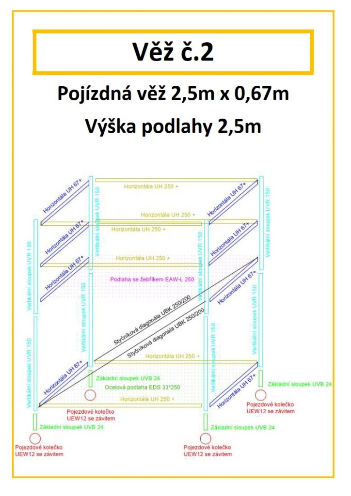 Věž č.2 - Pojízdná věž 2,5m x 0,67m, výška podlahy 2,5m