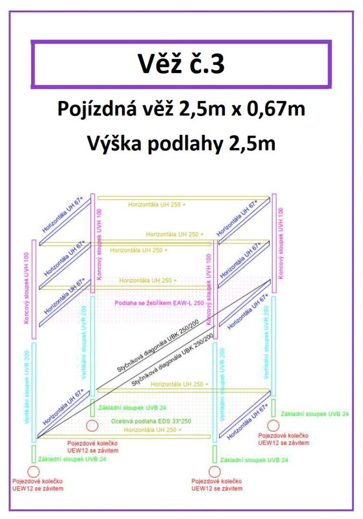 Věž č.3 - Pojízdná věž 2,5m x 0,67m, výška podlahy 2,5m