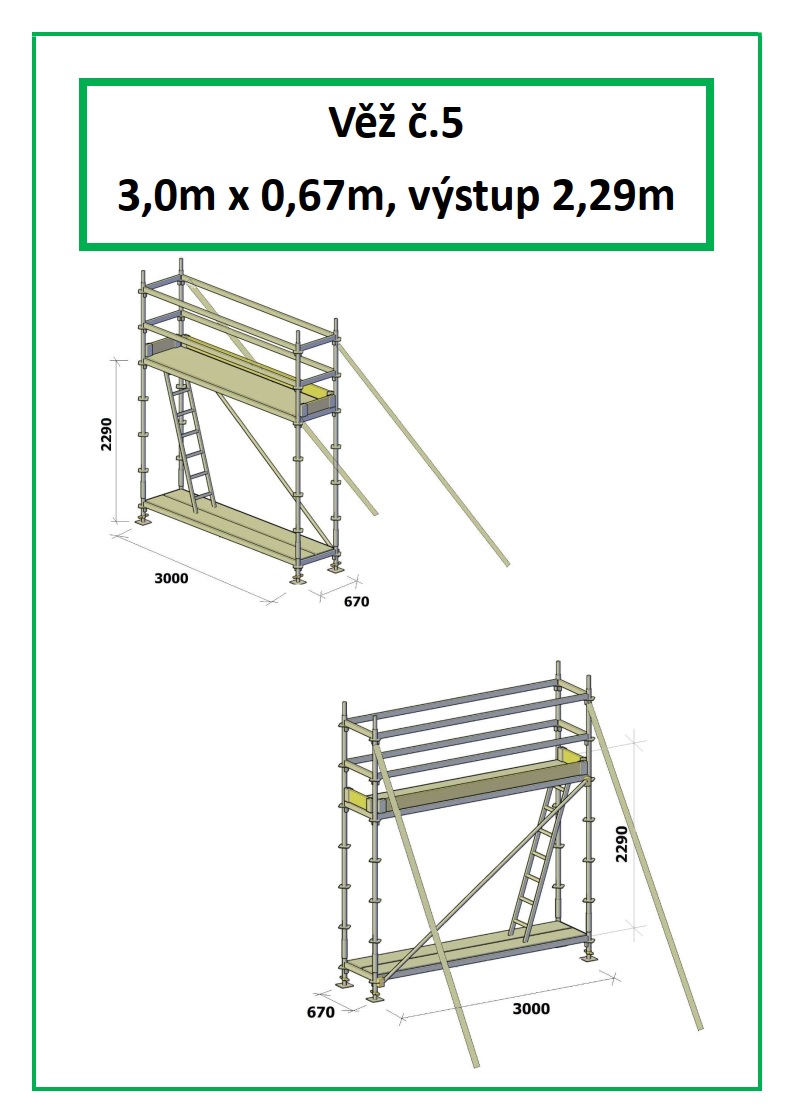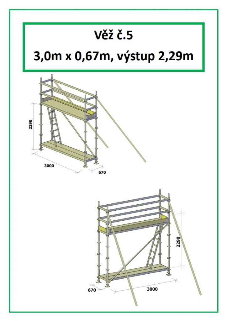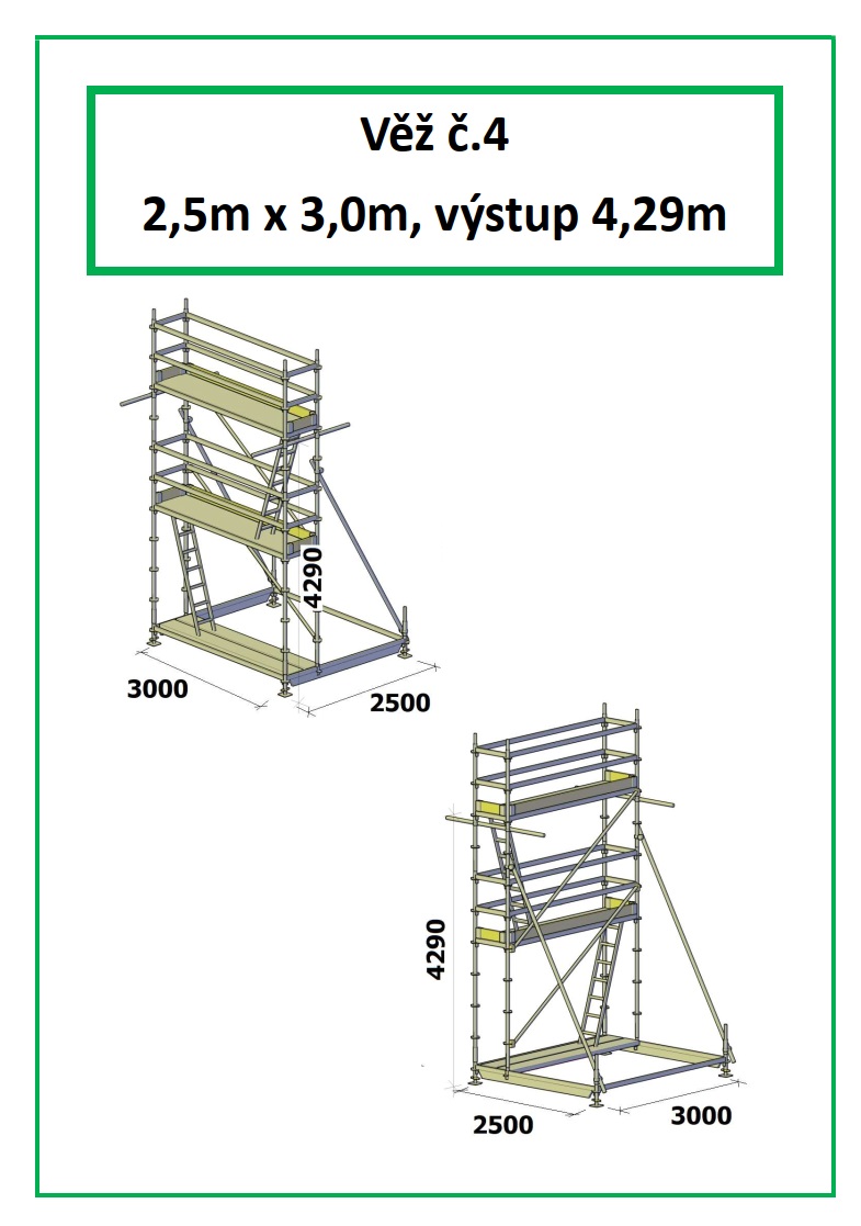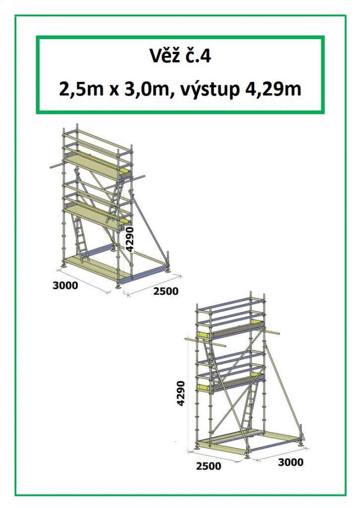 K dispozici máme věže pojízdné o výšce podlahy 2,5m až 4,3m, dále schodišťovou věž o celkové výšce 7,3m.