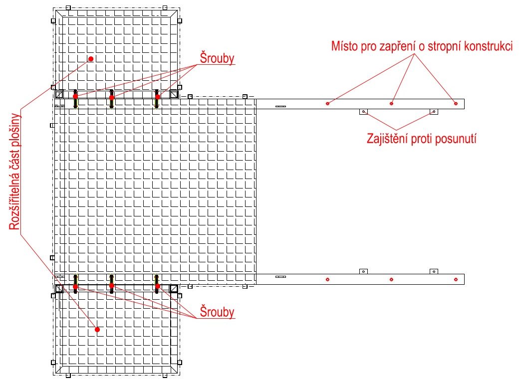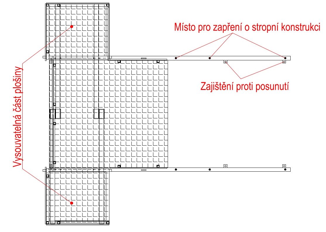 Plošiny jsou opatřeny odnímatelným zábradlím o výšce 1,10 m. Montáž plošiny na místo určení je za pomocí stropních podpěr rozepřených o strop následujícího patra a šrouby ke stropní konstrukci pod plošinou.
